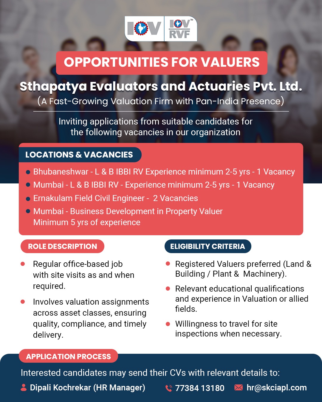Send your CV to hr@skciapl.com or contact Dipali Kochrekar (HR Manager) at 77384 13180.