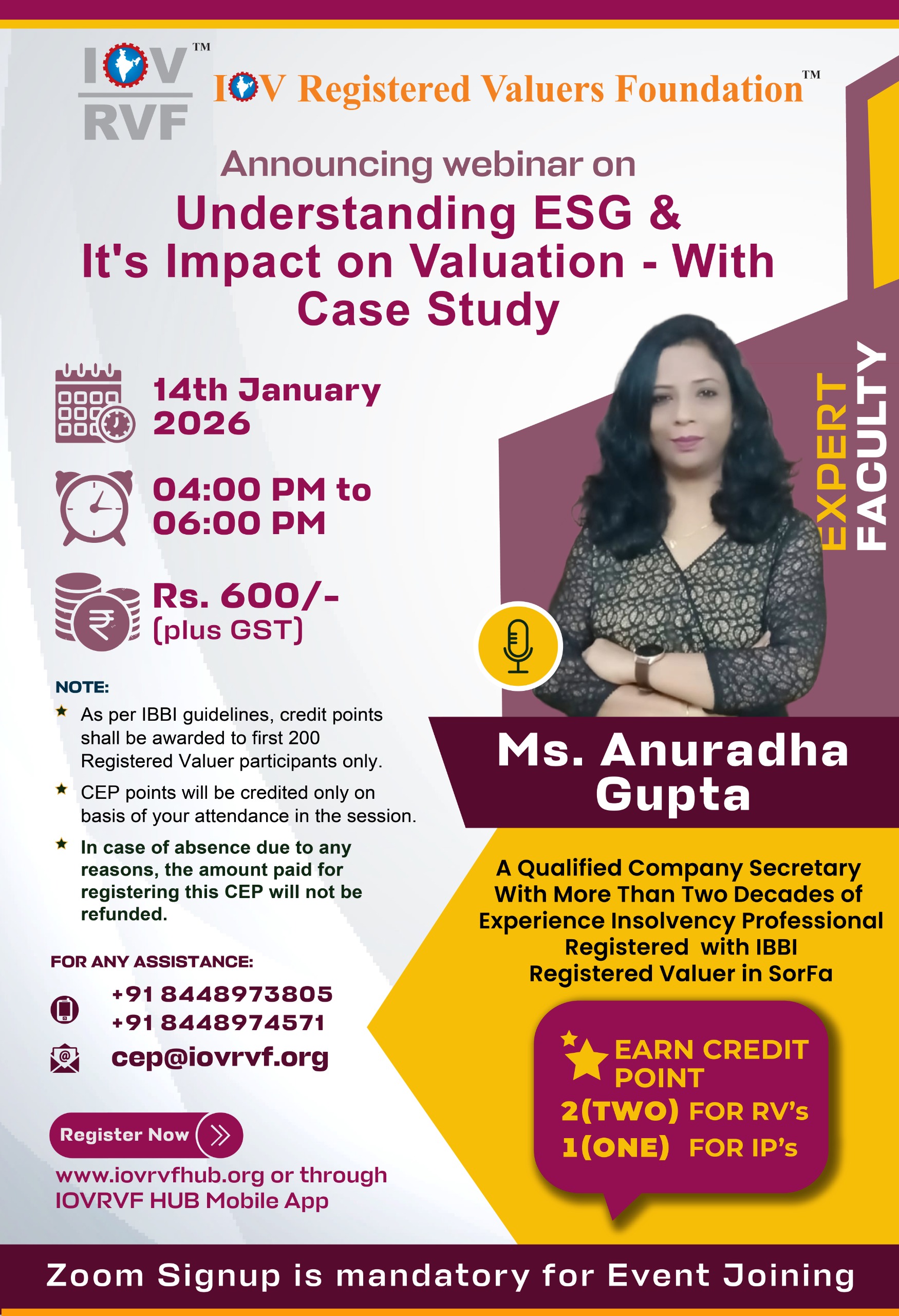 CEP Webinar On "Understanding ESG & It's Impact on Valuation - With Case Study" by Ms. Anuradha Gupta From 04:00 PM to 06:00 PM 14th Jan 2026 Ms. Anuradha Gupta New Delhi Online Register
